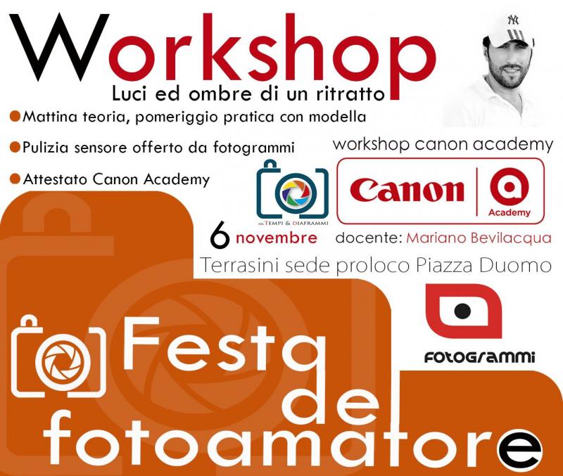 Nella giornata di domenica 6 novembre il docente Canon Academy docente Mariano Bevilacqua presenterà un workshop sulle luci ed ombre nel ritratto. Inoltre la ditta fotogrammi di Mariano Amoroso Canon Pro Partner per l’intera giornata del 4 novembre gratuitamente si dedicherà al checkup camera per tutti gli intervenuti.
