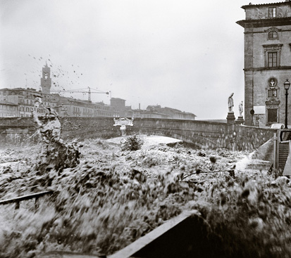 Da Tethys Gallery verranno proposte 16 immagini, oggi di proprietà, come tutto l’archivio Korab, della Biblioteca del Congresso, Divisione Stampe e Fotografie. Alcune sono state scattate proprio il 4 novembre, quando l’acqua ha rotto gli argini e invaso la città, altre sono dei mesi successivi, mentre Firenze cercava di rialzare la testa e salvare il suo immenso patrimonio. Ecco dunque le strade cittadine invase dall’acqua, coi fiorentini che s’ingegnano per guadarle come fossero fiumi, e poi, mentre la città rimane coperta di fango, per giorni e giorni, ecco i libri della Biblioteca Nazionale stesi ad asciugare nel suo androne o le statue della Gipsoteca in attesa di restauro nelle sale dell’Accademia di Belle Arti.