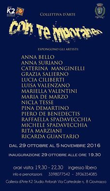 Sabato 29 ottobre alle ore 19,30 presso la Galleria d’Arte K2/ STUDIO /Anforah, in via Cattedrale 8 – centro storico – Giovinazzo (Ba) sarà inaugurata la collettiva pittorica dal titolo: “Con Te.mporaneo”. All’evento parteciperanno i seguenti artisti: Anna Bello, Caterina Manginelli, Grazia Salierno, Lucia Ciliberti, Luisa Valenzano, Mariella Valentini, Maria De Marzo, Nicla Tesse, Pina Demartino, Piero De Benedectis, Raffaella Spadavecchia, Michele Spadavecchia, Rita Marziani, Riccarda Guantario, Viviana Fasano.