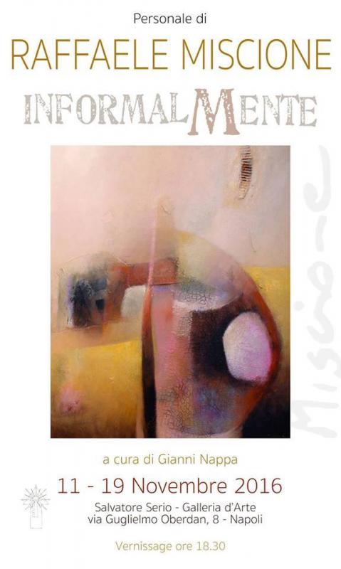 Sicuramente la parola ha un suo significato forte nell’esprimere il sentimento di questa mostra personale , che arriva dopo più di un anno dall’ultima che l’artista ha tenuto sempre a Napoli. Informalmente intende proprio la natura di un linguaggio pittorico che si è andando sempre più precisando nel segno dell’informale, con la ricerca dei materiali e di quegli elementi riconoscibili che non portano al di fuori del percorso ben tracciato da cromie equilibrate e materie. Una naturale evoluzione che Miscione ha accompagnato attraverso un impegno nel ricercare non già una sperimentazione, ma una essenza da far toccare concretamente ai sensi ed al tatto, propri di quell’esigenza di espressione mediata che l’artista ha sempre presentato come sua cifra riconoscibile, e sempre nella condizione di una ricerca tonale e di luce che sapesse essere resoconto del suo sentire per emozioni, piuttosto che per racconti, che invece il figurativo per forza di cose realizza. Un corpus di opere dove le tonalità vinaccia così come nei blu e colori medi, impegnano il primo sguardo di chi viene richiamato proprio da queste tensioni luminose, che insieme alle scelte di elementi come soldatini e altri materiali come pelle e tessuti, sono la struttura di un sentimento che in elegante stesura Miscione crea con maestria. Informalmente verranno anche i visitatori e i collezionisti, in un momento molto difficile per le sorti del mercato dell’arte, dove non esistono sforamenti dal solco della sicurezza; ebbene questa è una mostra che offre una sicurezza, quella di poter investire il giusto in opere mediate dalla capacità e dall’innato senso dell’estetica proprio della ricerca di un bello condiviso. Una mostra dunque che presenterà l’ultima produzione di Raffaele Miscione che dalla terra natia riprende le forti connotazioni mediterranee e che saprà come sempre trovare consensi ed estimatori per una forte impronta pittorica, che non ha tempo, se c’è è evidente che come nei tempi passati, è una dote innata costruita con il tempo nel solco di un personale divertimento che non ha l’esigenza esclusiva dell’esito di mercato, ma sa incanalarsi verso il solco di una pittura certa e per palati esigenti.