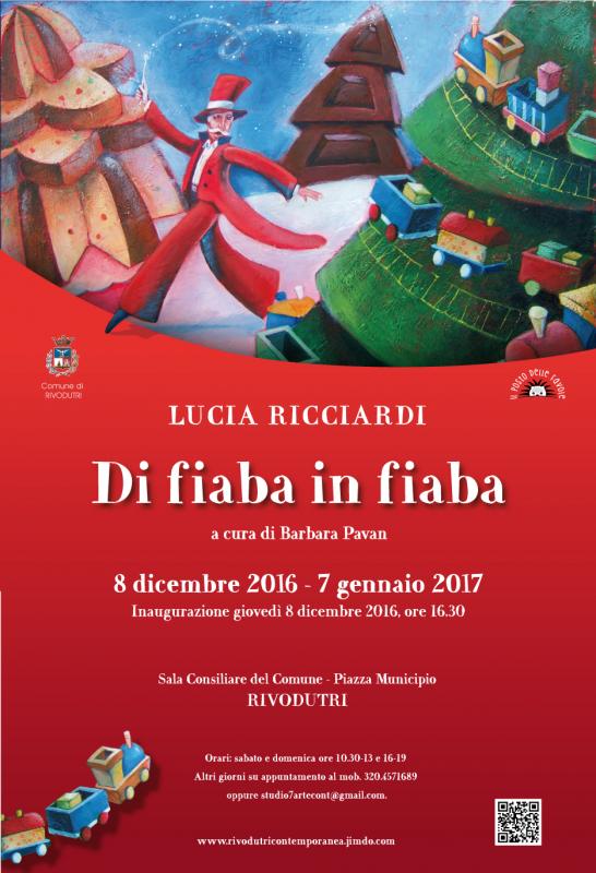 Il Comune di Rivodutri nell’ambito del progetto Rivodutricontemporanea promuove dall’8 dicembre 2016 al 7 gennaio 2017 presso la Sala Consiliare in piazza Municipio, la mostra di illustrazione per l’infanzia ‘Di fiaba in fiaba’, di Lucia Ricciardi, a cura di Barbara Pavan.
