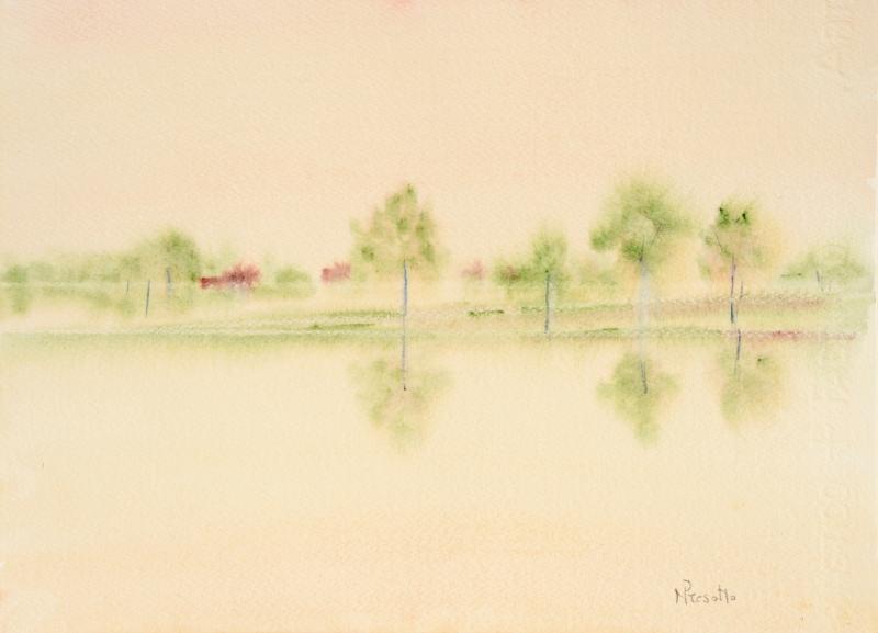 La tenuità e la leggerezza del colore accarezzano di eleganza gli elementi della natura e li fondono nel nostro pensiero restituendoci una dimensione di sogno: sogno di una natura incontaminata che l’uomo finalmente impara a cogliere nella intimità di un albero o di una distesa di erba, di una nuvola o di un tramonto.