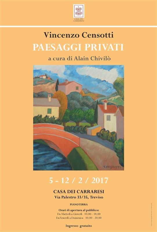 Valdichiana, Foiano, marine toscane, Treviso (scorci del Sile e del Montello), Auronzo, fino a giungere laddove la laguna veneziana passa a dialogare con il mare. Il Maestro Vincenzo Censotti nel 2017, a distanza di anni, grazie ad una collezione privata ritorna idealmente in una personale postuma nella sua Treviso, all’interno della prestigiosa sede di Casa dei Carraresi. Censotti (Foiano della Chiana, Arezzo, 1932 - Treviso 2005) ha unito nel suo iter pittorico due scuole artistiche, trovando in esse costanti elementi sinergici.