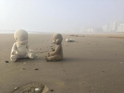 Con la sabbia, con la terra proveniente da Cuba e Lampedusa Carlo Pecorelli ha realizzato questa performance fotografica di sculture.