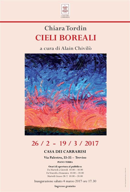 La pittrice bellunese Chiara Tordin espone per la prima volta nella prestigiosa sede di Casa dei Carraresi a Treviso. Il titolo della personale “Cieli Boreali”, a cura del critico e curatore d’arte Alain Chivilò, rappresenta e, allo stesso tempo, caratterizza l’attuale tematica dell’artista Tordin. Nei suoi lavori la volta celeste è ammirata e simultaneamente scolpita nell’anima dell’artista che, attraverso un processo mentale, la esteriora in molteplici significati. Il firmamento boreale, appartenente a un nord geografico, delle dolomiti bellunesi diviene spunto di approfondimento per contenuti complessi tipici della vita umana, perché come affermava Giovanni Pascoli “il cielo è pieno di visioni” che spesso non si è in grado sempre di percepire e interpretare. Dunque, tutto parte da una disamina all’interno della quale la pittrice Chiara Tordin pone la sua poetica artistica. L’empireo diventa metafora di vita e dei suoi molteplici aspetti perché esso stesso “tratta ugualmente tutti gli uomini” come da insegnamento di Confucio. Le opere della Tordin si alimentano costantemente proprio nel saper accostare e fare convivere colori a prima vista arditi, ma in un’attenta analisi sapientemente posti come la tradizione rinascimentale veneziana insegna. Azzurro, blu, rosso, arancione, giallo, viola, rosa, lilla propri del cielo sono in dialogo tra loro a livello aereo, ma anche con neri e verdi che stanno a livello del suolo per possibili montagne, colline e prati.