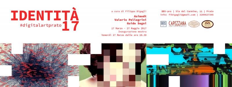 Venerdì 17 marzo alle 18.30 inaugura presso lo studio associato BBS-pro di Prato la collettiva Identità17 #digitalartprato a cura di Filippo Bigagli con lavori di Asimodt, Valerio Pellegrini e Guido Segni. Identità è una tematica contemporanea, spesso collegata al mondo di internet e soprattutto al socialweb dove sono facilmente reperibili immagini, dati personali e dettagli relativi alla vita privata degli utenti. Queste informazioni sono alla portata di tutti e sempre più frequentemente vengono violate per interessi individuali o per fini economici. Hacker che si impossessano dei dati di sconosciuti o di potenti personalità riuscendo ad agire indisturbati fino a tentare di influenzare importanti circostanze politiche, sono notizie di cui tutti noi siamo a conoscenza. Identità17 ci guida alla riflessione su questa tematica attraverso un linguaggio espressivo originale: i tre artisti coinvolti hanno uno stretto rapporto con le tecnologie informatiche e le utilizzano secondo modalità diverse. Le opere nascono su supporti virtuali, vengono processate con software, realizzate come stampe digitali e rese fruibili in forma quadro per sottolineare la netta appartenenza al settore artistico contemporaneo.