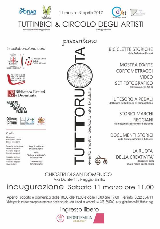Il Circolo degli Artisti di Reggio Emilia presenta, dall’11 marzo al 9 aprile 2017, presso i Chiostri di San Domenico (Via Dante, 11), “Raggi di biciclette”: evento dedicato alla bicicletta che comprende una mostra collettiva, un cortometraggio, un video e un set fotografico.