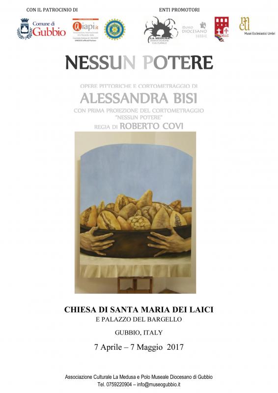 Verrà inaugurata venerdì 7 aprile alle ore 17,30 alla presenza delle autorità, la mostra personale e diffusa dell’artista Alessandra Bisi di origini Lombarde. Il progetto espositivo dall’evocativo titolo “NESSUN POTERE”, voluto e promosso dall’Associazione Culturale La Medusa, ha il patrocinio del Comune di Gubbio, dell’Inner Wheel Club Gubbio - Gualdo Tadino ed il prestigioso appoggio della AIAPI - International Association of Art UNESCO Official Partner.