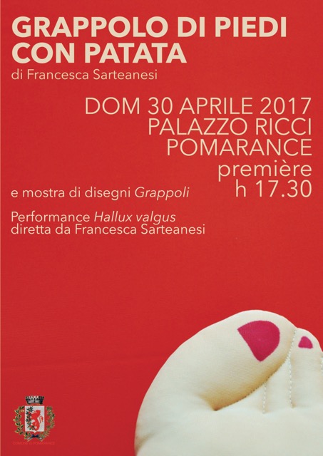 Siamo lieti di invitarVi, alla presentazione in prima assoluta dell'opera tridimensionale GRAPPOLO DI PIEDI CON PATATA (Dimensione opera metri 3,5x1,5) e della mostra GRAPPOLI di Francesca Sarteanesi, nota attrice della Compagnia Teatrale GLI OMINI, oltre che artista.