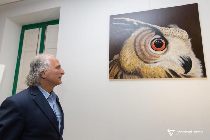 Infatti, l’immagine è dipinta in primo piano per mettere a fuoco l’occhio acuto della civetta con cui simbolicamente sorveglia questi luoghi e il suo becco con cui rompe il silenzio della notte emettendo un canto stridulo, ripetuto e molto nervoso per avvertirci anticipatamente che questi meravigliosi luoghi, lasciati così per come sono, saranno destinati in futuro ad essere meno popolati dai giovani e sempre più dalle civette. Giuseppe Indaimo.