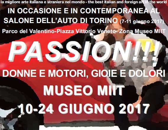 In occasione del rinnovato e storico Salone dell’Auto di Torino” e del Gran Premio di auto storiche che si svolgeranno dal 7 all’11 giugno 2017 al Parco del Valentino, vicinissimo al Museo MIIT e, con eventi e appuntamenti, anche nel centro della città CON L’ATTESA DI OLTRE 800.000 VISITATORI, il Museo MIIT, la rivista internazionale “Italia Arte” e la Galleria Folco, in collaborazione con musei, fondazioni e istituzioni pubbliche e private, presentano la mostra “PASSION!!! Donne e Motori... Gioie e Dolori”, che si terrà dal 10 al 24 giugno 2017 AL MUSEO MIIT DI TORINO per condividerne con un pizzico di ironia il grande fascino che il mondo delle automobili, del design, dell’eccellenza del Made in Italy da sempre esercitano nel mondo.