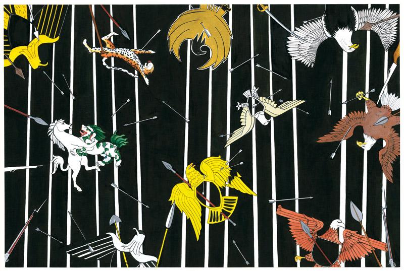 Allo SBLU_spazioalbello espone una serie di tavole che sono servite per realizzare il volume Across the Free Land. Un racconto che si sviluppa utilizzando gli elementi tipici dell’araldica presi dalle bandiere e dagli stemmi dei vari paesi del mondo.