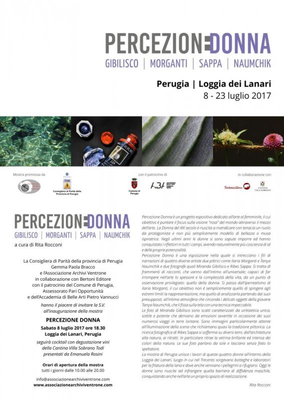 “Percezione Donna è un'esposizione nella quale s’intrecciano i fili di narrazioni di quattro diverse artiste due pittrici come Ilaria Morganti e Tanya Naumchik e due fotografe quali Miranda Gibilisco e Ribes Sappa. Si tratta di frammenti di racconti, che vanno dall'intimo all'universale; capaci di far irrompere nell'arte lo spessore e la complessità della vita, da un punto di osservazione privilegiato: quello della donna.”. Così Rita Rocconi, curatrice dell’esposizione perugina, ci introduce all’oggetto e alle protagoniste dell’evento. Promossa dalla Consigliera di Pari Opportunità della provincia di Perugia Gemma Paola Bracco e dall’Associazione Archivi Ventrone con il patrocinio del Comune di Perugia, -Assessorato Pari Opportunità- e dall’Accademia di Belle Arti Pietro Vannucci di Perugia, in collaborazione con Bertoni Editore “la mostra unisce i lavori di queste quattro donne all’interno della Loggia dei Lanari, luogo in cui nel Trecento sorgevano botteghe e laboratori per la filatura della lana e dove anche venivano i pellegrini a rifugiarsi. Oggi le donne sono riuscite ad infrangere quella barriera di diffidenza maschile, conquistando anche nell’arte un proprio spazio di realizzazione.”.