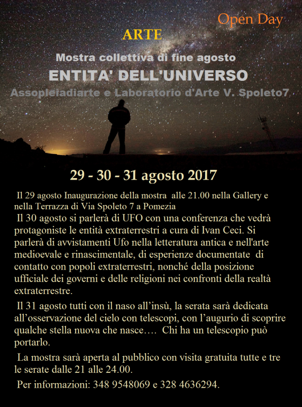 L’inaugurazione il 29 agosto. E’ un programma ricco, con brani musicali per viola e chitarra classica eseguiti dall’artista e musicista Paolo Derchi, racconti, letture e … poi il 30 agosto si parlerà di Ufo con una conferenza che vedrà protagoniste le entità extraterrestri a cura di Ivan Ceci. Poche righe per dare un'idea dei temi che verranno trattati durante la conferenza, nel corso della quale si parlerà di avvistamenti UFO nella letteratura antica e nell'arte medioevale e rinascimentale, di esperienze documentate, di contatto con popoli extraterrestri, nonché della posizione ufficiale dei governi e delle religioni nei confronti della realtà extraterrestre. Il 31 agosto tutti con il naso all’insù, la serata sarà dedicata all’osservazione del cielo, con l’augurio di scoprire qualche stella nuova che nasce…. < Sarà una mostra coinvolgente dove si evincerà la creatività a 360 gradi, con un tema che racchiude fascino, curiosità ed emozioni > ci riferiscono gli artisti Paolo Sommaripa e Rossana Urbani. La mostra sarà aperta al pubblico con visita gratuita il 29 - 30 - 31 agosto dalle 21 alle 24.00. Chi ha un telescopio può portarlo.