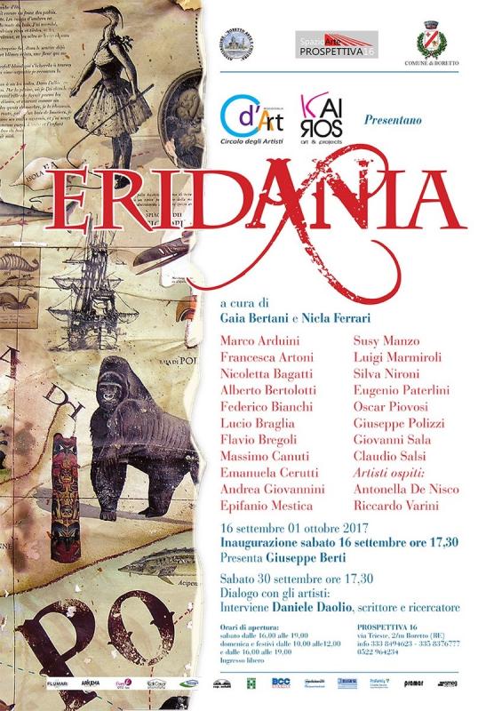 “Eridania” è il titolo della mostra promossa dal Circolo degli Artisti di Reggio Emilia e da Kairos art & projects, in collaborazione con SpazioArte Prospettiva16 che, dal 16 settembre al 1 ottobre 2017, ospita nei suoi spazi in via Trieste 2/m a Boretto (RE) le ricerche di diciannove pittori, scultori e fotografi iscritti al Circolo degli Artisti (Marco Aduini, Francesca Artoni, Nicoletta Bagatti, Alberto Bertolotti, Federico Bianchi, Lucio Braglia, Flavio Bregoli, Massimo Canuti, Emanuela Cerutti, Andrea Giovannini, Susy Manzo, Luigi Marmiroli, Epifanio Mestica, Silva Nironi, Eugenio Paterlini, Oscar Piovosi, Giuseppe Polizzi, Giovanni Sala, Claudio Salsi), unitamente a due invitati (Antonella De Nisco, Riccardo Varini).