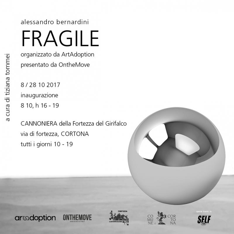 Domenica 8 ottobre 2017 dalle ore 16.00, presso la Cannoniera della Fortezza del Girifalco a Cortona, inaugura la mostra dal titolo Fragile, personale di Alessandro Bernardini a cura di Tiziana Tommei. L’evento, patrocinato dal Comune di Cortona, si inserisce nell’ambito della programmazione 2017 relativa all’arte contemporanea in Fortezza, è organizzato da Art Adoption, associazione attiva nella promozione e diffusione dell’arte contemporanea, e presentato dall’associazione OnTheMove. La mostra è stata realizzata grazie al supporto tecnico di Self Fioa.