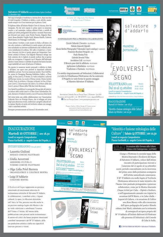 Si svolgerà a Filottrano dal 10 al 15 Ottobre (in occasione della Giornata della Cultura Cubana e Arte Contemporanea AMACI) la seconda tappa della Mostra itinerante “L’Evolversi del Segno” di Salvatore D’Addario, reduce dall’ottimo riscontro di partecipazione ricevuto a Camerano dal 10 agosto al 24 settembre scorsi, periodo concomitante con la ricorrenza del primo anno dalla prematura scomparsa dell’Artista naturalizzato cameranese. Il M° D’Addario era molto legato al Territorio Filottranese attraverso le tante iniziative che l’hanno visto puntuale protagonista e generoso collaboratore, come nella Mostra itinerante “Cinque Artisti per Cuba – Dipinti e Sculture”, o nell’appuntamento annuale con “Légàmi” in occasione dell’8 Marzo, o in “Cuba>Italia – Legami di Cultura” o in occasione di “Coltivo una Rosa Bianca” volto alla conoscenza dell’opera pedagogica del poeta e filosofo cubano José Martì, culminato con la cerimonia di consegna di un’opera proprio del M° D’Addario all'Istituto “Beltrami” di Filottrano alla presenza di Istituzioni e del Console di Cuba in Italia.