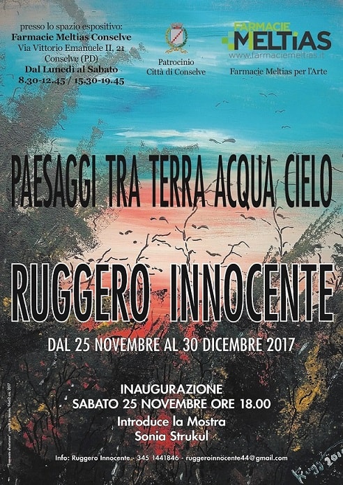 Presso lo Spazio Espositivo della Farmacia Meltias di Conselve (Padova) continuano gli appuntamenti con l’arte a cadenza mensile. Dal 25 novembre al 30 dicembre 2017 saranno protagonisti i “Paesaggi tra terra acqua cielo” di Ruggero Innocente, maestro artigiano (titolo conferitogli da Confartigianato Europa) dipinge paesaggi legati al territorio Veneto, luogo dove affondano le sue radici. Ruggero Innocente coglie le atmosfere, i colori, le vibrazioni della sua terra, la bassa padovana, che celebra con messaggio forte e leggibile. Due gli eventi collaterali alla mostra: sabato 2 dicembre ore 18.00 Silvia Gorgi ci racconterà curiosità, storie inedite luoghi poco conosciuti, della città del Santo tratte dal suo libro “Forse non tutti sanno che a Padova” (Newton Compton editori, 2016). Mentre sabato 16 dicembre ore 18.00 verrà presentato il cortometraggio di Renata Berti “Confini violati” (2015).
