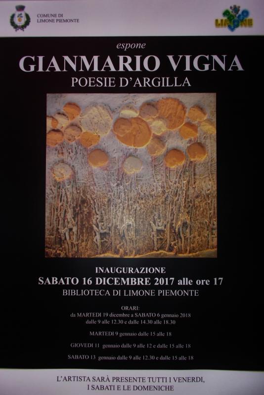 Sarà inaugurata sabato 16 dicembre 2017 alle 17 la mostra di Gianmario Vigna “Poesie d’argilla”, che sarà ospitata per le festività natalizie nelle sale della Biblioteca-Museo dello sci in piazza Henri Dunant a Limone.