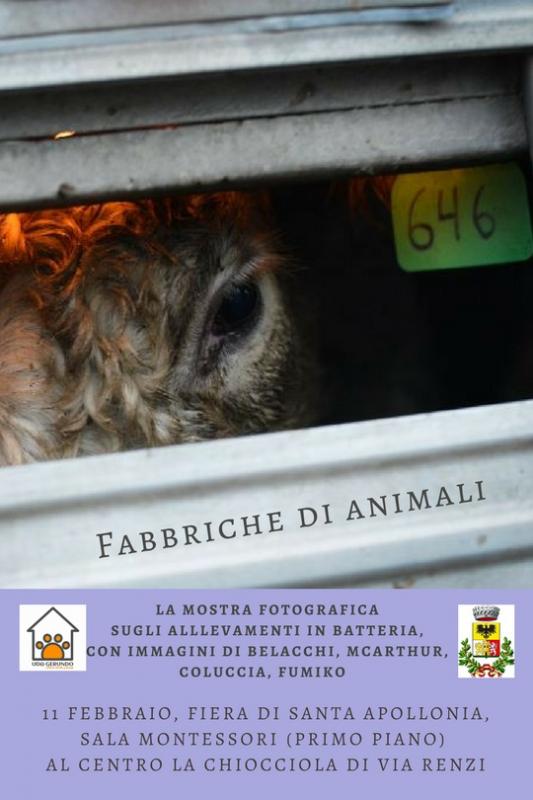 Durante la Fiera Agricola Regionale di santa Apollonia, a Rivolta d'Adda CR, il prossimo 11 febbraio, l'Ufficio Diritti Animali comunale festeggia il suo primo anno di vita organizzando una mostra fotografica sugli animali negli allevamenti intensivi, con bellissime immagini (toccanti ma non splatter: mostra adatta a tutti) di McArthur, Belacchi, Scelgo Veg, Farm Sanctuary, Ball, Coluccia, Shevi e altri.