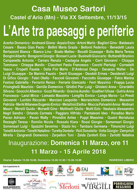 La mostra “l’Arte tra paesaggi e periferie” si inaugura Domenica 11 Marzo alle ore 11.00, con interventi di Arianna Sartori curatrice della mostra e del catalogo, Daniela Castro Sindaco di Castel d’Ario, Beniamino Morselli Presidente Provincia di Mantova, Mattia Palazzi Sindaco di Mantova e Maria Gabriella Savoia ‘Casa Museo Sartori’ e autrice del testo critico pubblicato nel catalogo, alla presenza degli artisti che sono stati invitati dalla curatrice Arianna Sartori a presentare un’opera in questa rassegna.