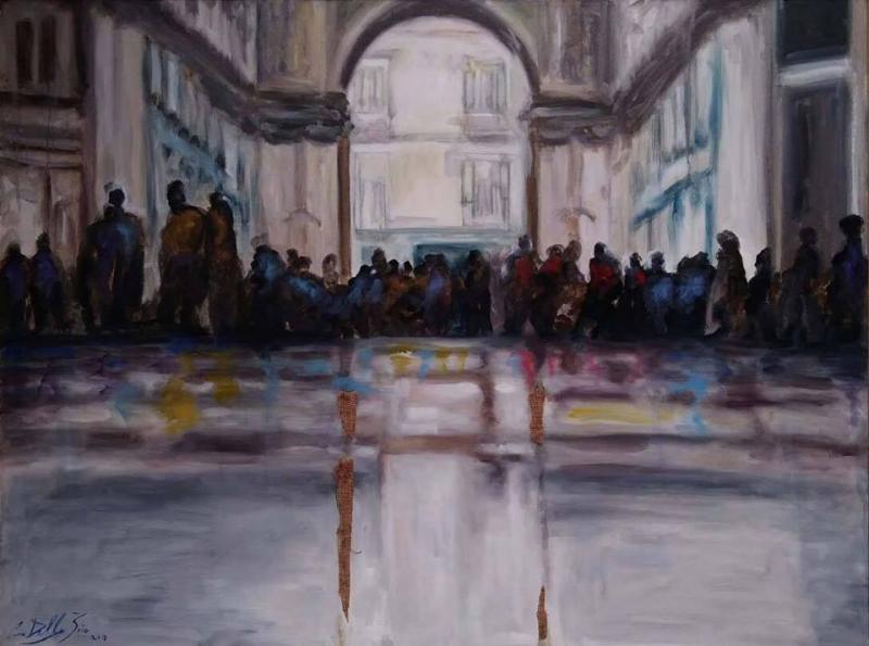 “Nessuno se ne accorge, forse, ma l’umanità ha bisogno di poesia”. (Maria Luisa d’Aquino)Una poesia che non è semplicemente quella dei versi o delle note che si susseguono su un pentagramma. La poesia, tra i tanti linguaggi in cui si manifesta, si presenta anche in quello figurativo, quello dell’infinita bellezza artistica.Lo spazio che emerge da un quadro è lo spazio in cui riversiamo pensieri e trasporti emotivi. “E se il mondo ha l’anima come in letargo” le Arti si innalzano come baluardi fondamentali alla sopravvivenza, creando un’atmosfera altra, vibrante di vita e lontana dai tormenti terreni.Una vita e una poesia che nelle opere di Carmine dello Ioio traspaiono nella scelta dei personaggi raffigurati, negli scorci della millenaria città che l’artista ben conosce e nell’eleganza soave e silente dei suoi secolari portali.È un’indagine decennale quella condotta dal pittore, una ricerca assidua finalizzata a cogliere attimi ispiratori, soggetti parlanti nella loro immobile quotidianità. Immagini di vita da tradurre in poesia pittorica. L’ambientazione di questo percorso è sempre la stessa, quella della città partenopea con il suo scorrere fluente, le sue aperture e le sue contraddizioni. Quando la mente dell’artista si svuota di preoccupazioni e pensieri vani giunge il momento di assecondare la vena creativa. Il tempo trascorre senza più incidere sui secondi dell’esistenza. Occorre fermarsi, osservare, tracciare fugacemente su un taccuino quell’immagine di vita, prima che scompaia, eseguire un bozzetto preparatorio che ricordi l’attimo che non deve fuggire. Un’operazione che il pittore compie anche attraverso l’utilizzo della macchina fotografica, focalizzando paesaggi, vedute, oggetti e persone. La stessa città fornisce all’artista supporti di recupero su cui realizzare l’opera finale. La tecnica è armonico caos: colori a pastello, acrilici, biro, inserti di stoffa. Le sfumature variano colore giocando con le emozioni del momento. Il pittore si pone come osservatore, attraversa la città nei suoi punti cruciali, lì dove la folla spontaneamente e inesorabilmente ogni giorno si aggrega. Tante storie, tanti sguardi si incrociano senza conoscersi e a loro insaputa l’artista è pronto a spiarli. Dell’interno in Galleria ne descrive il sonoro, i brusii di fondo, i disordinati passi. Il dipinto sembra restituire anche ciò che è lontano, il traffico continuo, gli estenuanti claxon, la fuliggine dei gas di scarico che giunge dall’esterno a inondare la superficie pittorica. Individualità complesse e infinite razionalità vivono nella folla che possiede, tra le poche certezze, quelle degli appuntamenti fissi, dei passaggi obbligati.Il punto di fuga è il mare. Lo si scorge in lontananza. Basta un colpo d’occhio in fondo alla discesa per riconoscerlo e sincerarsi che sia ancora lì, pronto a bagnare la città e ad aspettare il suo popolo.La pittura di Carmine Dello Ioio, pur traendo il proprio motif dalla realtà, alle volte si unisce con il mondo fantastico dell’infanzia, con quei tocchi delicati e puri impressi dalla giovanissima discepola Marida.Fedela Procaccini