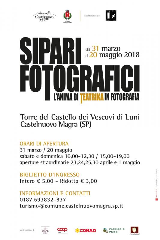 Dal 31 marzo al 20 maggio 2018 alla Torre del Castello dei Vescovi di Luni a Castelnuovo Magra, La Spezia, si terrà la mostra “Sipari Fotografici. L’anima di Teatrika in fotografia”.