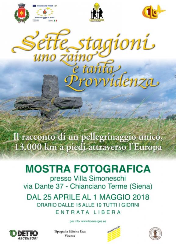 A Villa Simoneschi il racconto di un pellegrinaggio che ha percorso 13 mila Km percorrendo 35 vie di Fede Chianciano Terme (Siena) – Si inaugura mercoledì 25 aprile 2018 alle ore 16.00 a Chianciano Terme, presso Villa Simoneschi, la mostra fotografica “Sette stagioni, uno Zaino e tanta provvidenza, così ho attraversato l’Europa” a cura di Francisco Sancho, spagnolo di origine e vicentino d’adozione, che ha fatto del pellegrinaggio la sua espressione di vita cristiana. La mostra fotografica racconta un’esperienza straordinaria di fede, di sofferenza ma anche di grande gioia che ha portato Francisco Sancho ad essere “il pellegrino dei record”, realizzando un sogno che coltivava da anni. Partito l’8 settembre del 2015, in compagnia del suo “fedele” zaino e “con il cuore colmo di fede”, Francisco Sancho ha iniziato il percorso da Czestochowa (Polonia) con il sogno di unire tre fra più importanti luoghi di pellegrinaggio del Medioevo, ovvero Roma, Santiago de Compostela e Trondheim in Norvegia. Ha camminato per 13 Mila Km, riuscendo a collegare 35 vecchie vie di Fede, visitando più di 400 mete di pellegrinaggio e consumando 5 paia di scarpe.