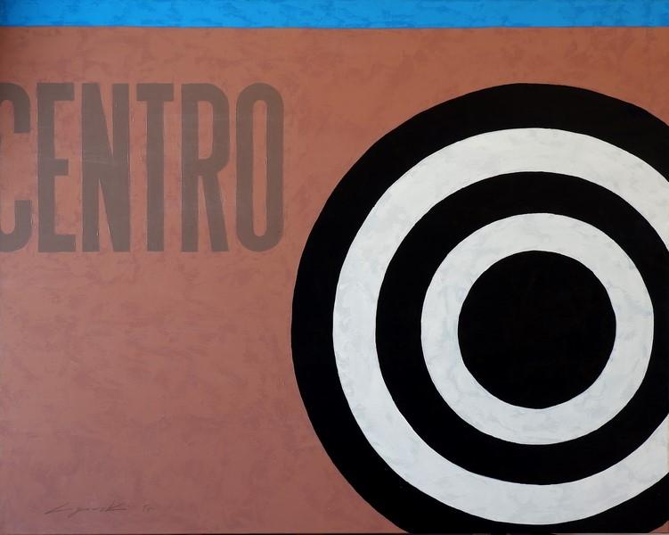 «Avanti e Stop, Alto e Retro, Attendere prego, Una volta al dì. Indicazioni che – scrive la curatrice Chiara Serri – nelle mani dell’artista si svuotano in parte del loro significato originario diventando immagini, icone pop prese in prestito dal mondo della grafica pubblicitaria e tradotte in pittura. Sia le scritte segnaletiche che i simboli riferibili alle spedizioni del settore packaging, o ancora i pittogrammi di pericolo, non sono riportati nella loro interezza, ma in parte, secondo inquadrature che elidono frasi o parole, ponendo il più delle volte il “Centro” fuori dal centro. Un pensiero “laterale”, per citare Edward de Bono, che ci suggerisce di guardare la realtà da angolazioni diverse, a prescindere da quello che potrebbe apparire come l’unico percorso possibile».