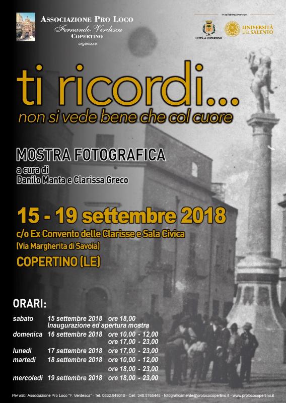 In occasione della prossima festività patronale di Copertino, la locale Associazione Pro Loco ‘F. Verdesca’, in collaborazione con la Città di Copertino e l’Università del Salento, organizza la mostra fotografica intitolata "ti ricordi…non si vede bene che col cuore".La mostra è a cura del dott. Danilo Manta (storico della fotografia, nonché coordinatore e curatore della mostra – sezione storica) e Clarissa Greco (curatrice - sezione moderna).Gli ambienti proietteranno una duplice visione della nostra città: la prima nostalgica, con gli scatti di un tempo che rimandano ad un sentimento complesso, sfaccettato, a metà tra lo struggimento per ciò che è stato e non è più e la gioia piena della memoria; la seconda più moderna ed attuale, dove ogni click ferma il tempo su quello che è oggi il nostro amato borgo.