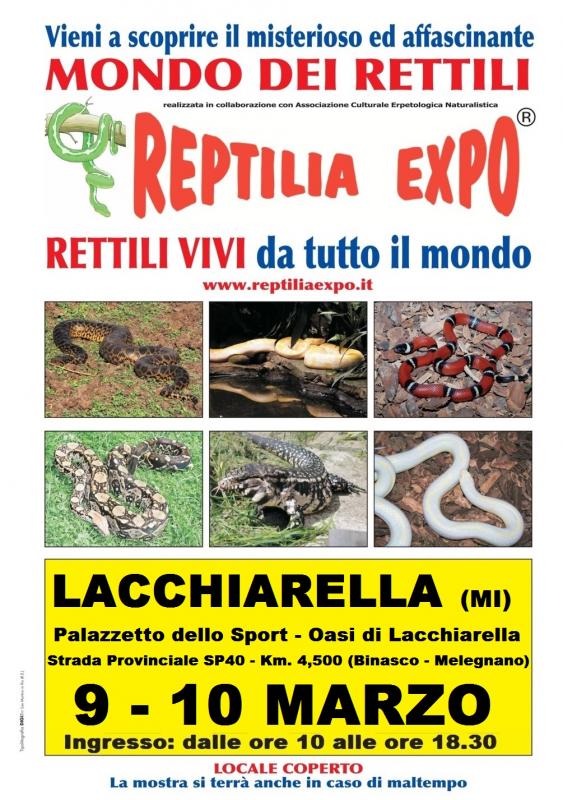 Reptilia Expo - l'affascinante mondo dei rettili presso il Palazzetto dello Sport di LACCHIARELLA (Centro Sportivo Oasi - Strada Provinciale SP40 km. 4,500) nelle giornate di sabato 9 e domenica 10 Marzo proponendo una interessantissima Mostra dove, con orario dalle ore 10 alle ore 19, si potranno ammirare, contenuti all'interno di tanti terrari, moltissimi serpenti tra i più belli ed affascinanti.