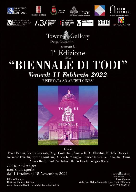 L’11 febbraio 2022, Giornata Mondiale del Malato e Anno della Cultura e del Turismo Italia – Cina 2022, verrà inaugurata la prima edizione della Biennale di Todi nata dall'idea del gallerista e antiquario Diego Costantini di portare l'arte negli spazi aperti della città di Todi, con un’azione che arricchisca i luoghi di significati unici e inattesi. Simbolo della città e capolavoro rinascimentale mondiale è il Tempio di Santa Maria della Consolazione, luogo prescelto per ospitare, nello spazio antistante, una grande installazione ambientale selezionata da una giuria di esponenti del mondo dell’arte che, partendo dal genius loci proprio del Tempio ruoterà di volta in volta intorno al concetto di Consolazione nelle sue vaste interpretazioni e sfumature.