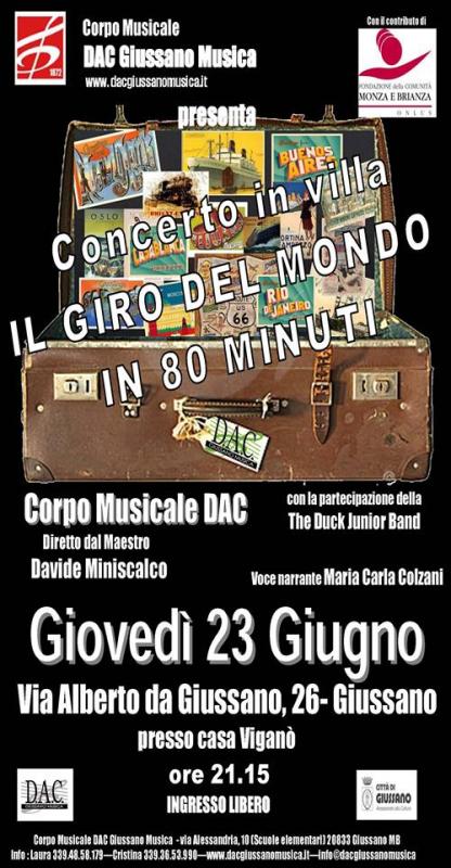Nell'ambito dell'iniziativa culturale MUSICA IN VILLA IN PIAZZA E NEI CORTILI a cura delle Bande Musicali della Provincia di Monza e Brianza associate all’Associazione Nazionale Bande Italiane Musicali Autonome con il contributo della FONDAZIONE DELLA COMUNITA' MONZA E BRIANZA ONLUS il CORPO MUSICALE D.A.C. GIUSSANO MUSICA propone “”IL GIRO DEL MONDO IN 80 MINUTI”.