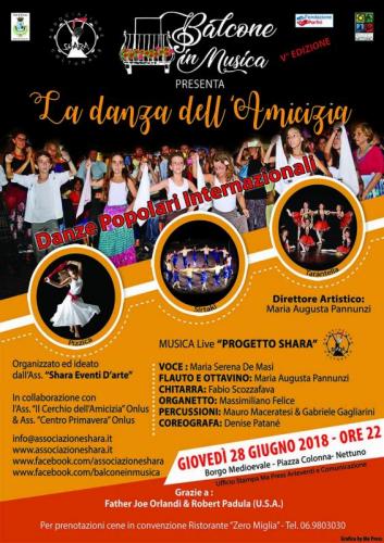 L’Associazione Shara (Nettuno) ha organizzato e presenta per giovedì 28 giugno dalle ore 22.00 in poi, nell’ambito della V° Edizione 2018 del Festival “Balcone in Musica e Spettacolo” all’interno della magica cornice dell’antico Borgo Medievale di Nettuno(Rm) in collaborazione con la Onlus Il Cerchio dell’Amicizia (Roma):