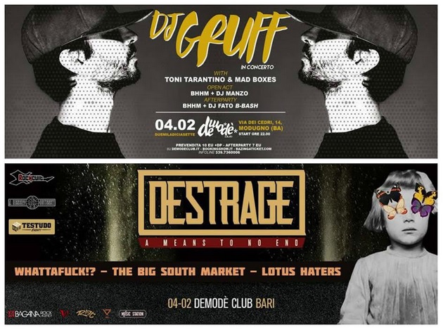 Due appuntamenti live imperdibili sabato 4 febbraio al Demodè Club di Modugno: da una parte la storia dell'hip hop con Dj Gruff e dall'altra le poderose sonorità metal con la band milanese Destrage.