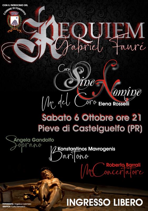 In occasione della storica ricorrenza della “Madonna del Soldato” che si celebra dal 1941, dove si ricordano i caduti di tutte le guerre e si invoca la pace nel mondo, Sabato 6 ottobre alle 21 nella chiesa di Castelguelfo verrà eseguito il “Requiem di Gabriel Faurè” dal coro “Sine nomine” diretto dal maestro Elena Rosselli, Soprano Angela Gandolfo, Baritono Konstantinos Mavrogenis e Maestro concertatore al pianoforte Roberto Barrali. Con il patrocinio ed il contributo del Comune di Fontevivo.