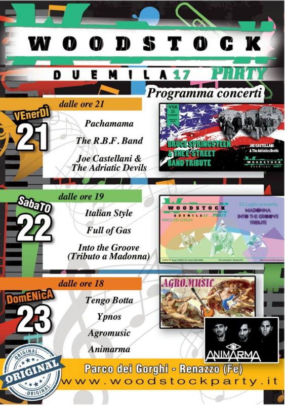 La 21^ edizione del Woodstock Party si svolge dal 21 al 23 luglio 2017 al Parco dei Gorgi di Renazzo, frazione del Comune di Cento (FE).