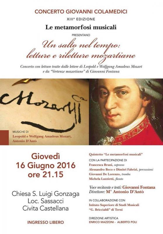 Il quintetto “Le metamorfosi musicali”, con la partecipazione del soprano Francesca Bruni, dei percussionisti Alessandro Beco e Dimitri Fabrizi, del trombettista Giovanni De Lorenzo e della flautista Michela Luzzietti, presenterà il concerto dal titolo “Un salto nel tempo: letture e riletture mozartiane” che affiancherà, in un gioco di rimandi e citazioni, musica e testi tratti dalle lettere di Leopold e Wolfgang Amadeus Mozart e da “Vertenze mozartiane” di Giovanni Fontana.