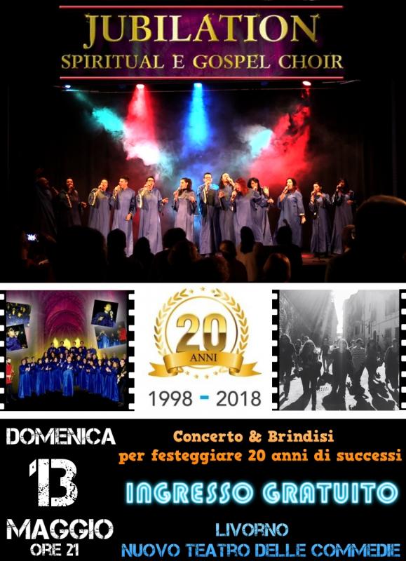 Il coro Jubilation vi aspetta numerosi per brindare e festeggiare insieme i 20 anni di attività con un concerto gratuito che si terrà alle ore 21 presso il Nuovo teatro delle commedie (via terreni – Livorno) - INGRESSO GRATUITO