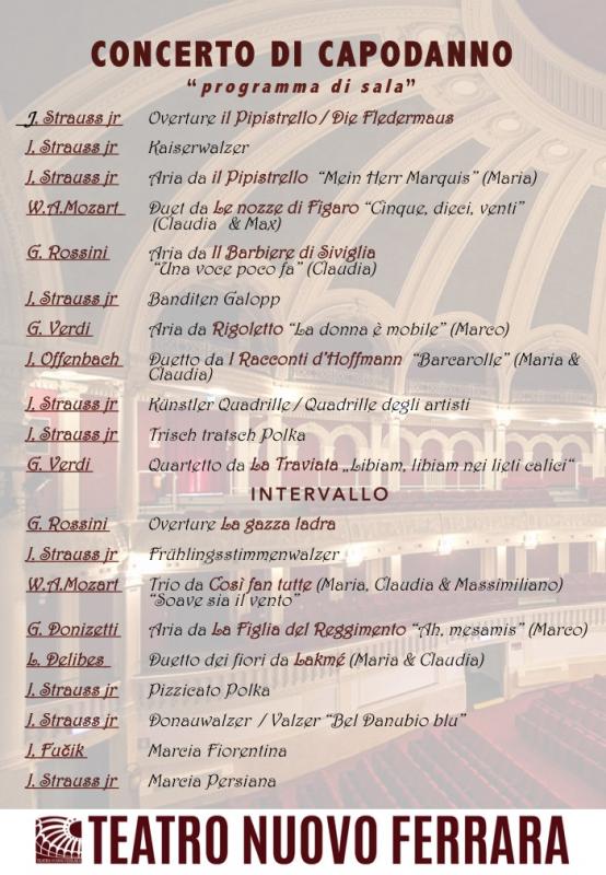 Dal Donauwalzer alla Marcia di Radetzky, dalla Traviata di Giuseppe Verdi al Pipistrello di Johann Strauss; dalla Figlia del Reggimento di Gaetano Donizetti al Barbiere di Siviglia di Giacomo Rossini, fino ai Racconti d’Hoffmann di Jacques Offenbach: martedi 27 dicembre 2016, il Teatro Nuovo di Ferrara propone il “GRAN CONCERTO DI CAPODANNO”, un’occasione unica per ascoltare celebri valzer viennesi, ouverture, arie e duetti dell’opera italiana, tratti dalle opere più celebri (ore 20.30, Piazza Trento e Trieste n.52). A interpretarli saranno i solisti il soprano siciliano Maria Francesca Mazzara, il tenore Marco Miglietta, il soprano Claudia Ciabattini e il basso Max Medero, con una vasta esperienza e un repertorio vario. Ad eseguire la Musica Viennese ed accompagnare i cantanti lirici ci sarà l’Orchestra del Carmine, formata da oltre 35 elementi e diretta dal M° Alvaro Lozano.