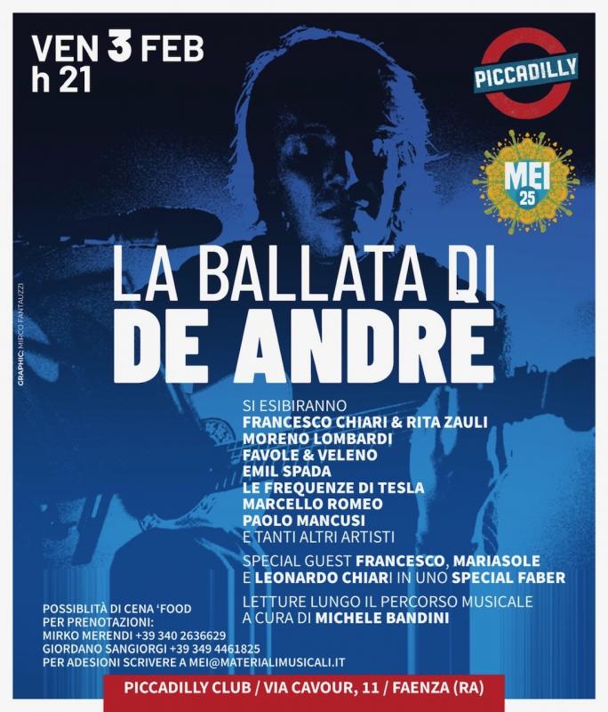 Invece le canzoni di Fabrizio restano, cosi ha detto il grande Nicola Piovani, un grande compositore italiano che fu tra gli arrangiatori dei suoi migliori dischi, e cosi ci rifacciamo a questa dichiarazione per una serata Made in MEI di Faenza dedicata a Fabrizio De Andrè.