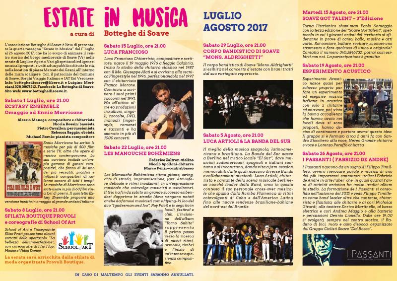 L'associazione Botteghe di Soave è lieta di presentare la quarta rassegna "Estate in Musica" dal 1° luglio al 26 agosto 2017, che ha lo scopo di animare il centro storico del borgo medioevale di Soave (Vr) nelle serate di Luglio e Agosto. Vari gli spettacoli ed i generi musicali proposti, rivolti ad un pubblico di tutte le età, nella location di piazza Mercato dei Grani, all’interno delle mura scaligere. Tutti gli eventi avranno inizio alle ore 21,00, sono gratuiti ed in caso di maltempo saranno annullati.