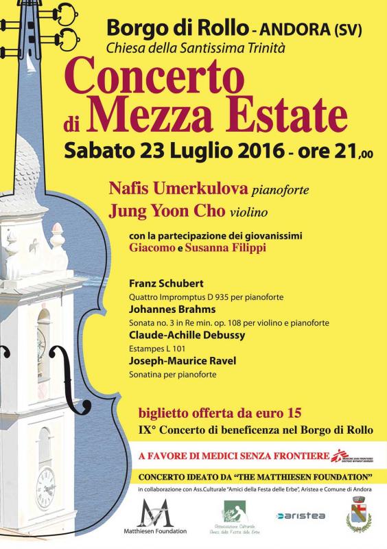 “Il “Concerto di Mezza Estate” 2016 è ideato e offerto da "The Matthiesen Foundation" (www.thematthiesenfoundation.org ) di Londra, con la partecipazione dell’Associazione Culturale “Amici della Festa delle Erbe”, la collaborazione di Aristea, il Patrocinio e l’Accoglienza del Comune di Andora e l’ospitalità della Chiesa della S.S. Trinità