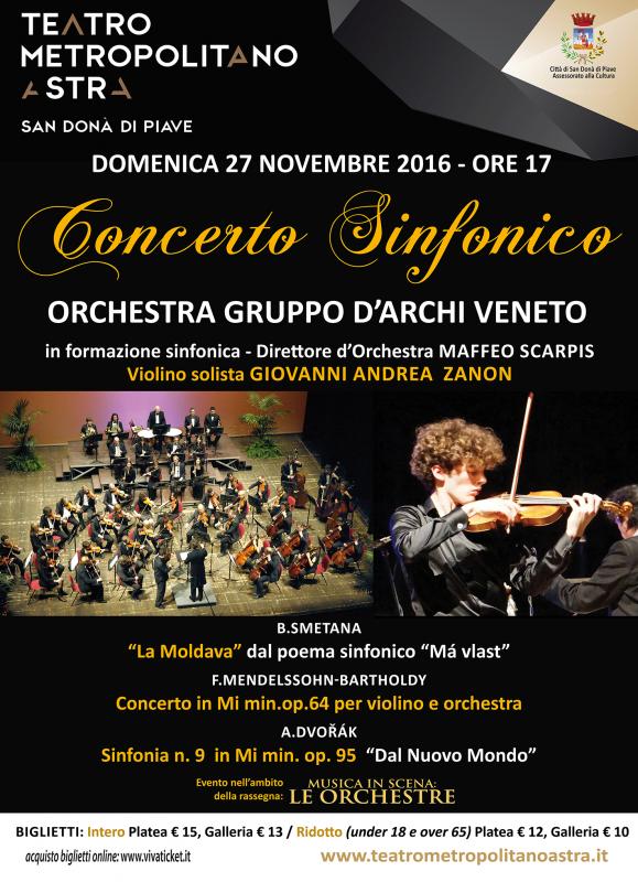 Una vera “chicca” sarà rappresentata dal celebre concerto per violino op.64 di F.Mendelssohn, che, dopo il grande successo riportato lo scorso anno, vedrà ancora impegnato con l’orchestra in veste di solista il diciottenne violinista trevigiano Giovanni Andrea Zanon, ormai proiettato verso le vette del concertismo mondiale, diplomatosi al Conservatorio di Venezia all’età di tredici anni e da poco perfezionatosi presso la famosa Manhattan School di New York. Già lo scorso anno Zanon ha incantato il pubblico del Teatro Metropolitano Astra, gremito per l’occasione con il suggestivo concerto di Tchaikovsky per violino e orchestra.