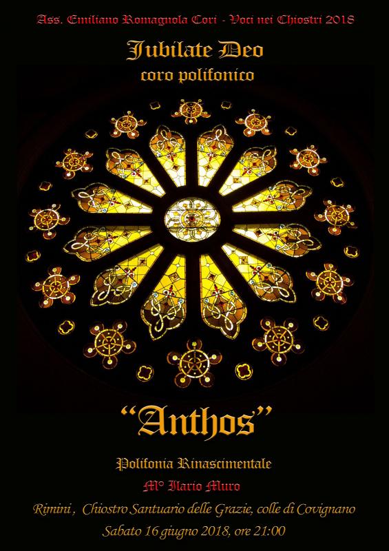 Sabato 16 GIUGNO 2018 alle ore 21,00 nel chiostro del Santuario delle Grazie di Rimini (Colle di Covignano), il CORO POLIFONICO JUBILATE DEO, presenta il concerto di polifonia rinascimentale: “ANTHOS”.