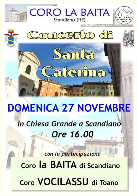 Domenica 27 novembre alle 16,30 nella Chiesa Parrocchiale di Scandiano Centro il coro La Baita di Scandiano organizza, in occasione della festa della patrona della città, il tradizionale concerto di Santa Caterina. Ospite del Coro La Baita diretto dal maestro Fedele Fantuzzi sarà il Coro Vocilassù di Toano diretto dal maestro Armando Saelli Dalle ore 16.00 le note, le armonie e i canti delle due formazioni reggiane allieteranno il pomeriggio del centro scandianese già carico e pieno di eventi con bancarelle, negozi aperti data l’occasione, per un pomeriggio da non perdere per gli amanti delle tradizioni e del buon canto.