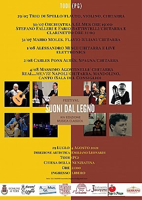 TODI - Anche quest’anno torna il Festival “Suoni dal Legno” giunto alla sua XIV° edizione. Un Festival diventato ormai un appuntamento fisso dell'estate tuderte. Dal 16 Luglio al 4 Agosto, in un formato smart e in linea con la normativa anti-covid, in collaborazione con l'amministrazione comunale, si alterneranno spettacoli comici, musica d'autore e musica classica nelle più belle locations dell’incantevole Todi.