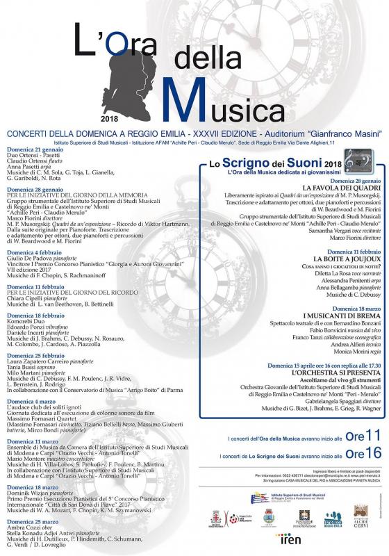 Torna per la XXXVII edizione L'Ora della Musica - Concerti della domenica, rassegna concertistica che ogni anno promuove giovani musicisti, presso l'Auditorium "Gianfranco Masini" dell'Istituto Superiore di Studi Musicali "Peri-Merulo", via Dante Alighieri 11.