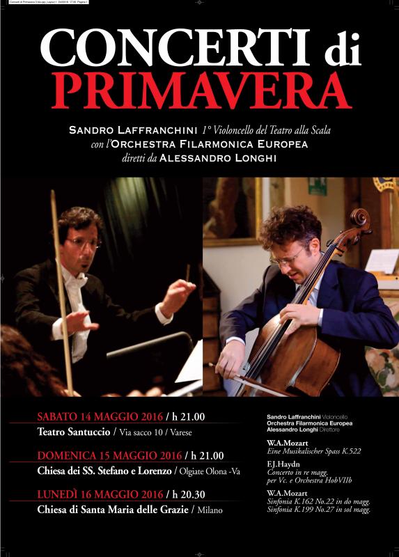 Sandro Laffranchini. Discendente da una famiglia di musicisti bresciana, intraprende lo studio del violoncello all’età di sei anni sotto la guida del padre (Primo violoncello dell’Orchestra del Teatro alla Scala dal 1969 al 2005) e prosegue al Conservatorio di Milano con Maria Leali, dove si diploma nel 1993 con lode e menzione d'onore. Si perfeziona poi presso la Fondazione Romanini di Brescia con Mario Brunello, l’AccademiaWalter Stauffer di Cremona con Rocco Filippini e la Hochschule für Musik di Basilea con Thomas Demenga, nel 1999. Ricevuti riconoscimenti nei principali concorsi internazionali italiani (Concorso Stradivari, Rotary, Pinerolo, Stresa), nel 1998 vince il concorso per Primo violoncello all'Accademia di Santa Cecilia a Roma e, l’anno successivo a Milano, si classifica primo al concorso per Primo violoncello dell’Orchestra del Teatro alla Scala e dell’Orchestra Filarmonica del Teatro alla Scala, ruolo che ricopre tuttora. Dal 2003 collabora come violoncello di spalla con la World Orchestra for Peace, diretta da Valery Gergiev, con la quale ha effettuato tournèes nelle sale più prestigiose a livello mondiale, suonando fra l'altro il celebre assolo del Guglielmo Tell di Rossini per i BBC Proms alla Royal Albert Hall di Londra.