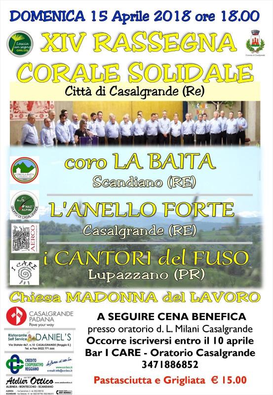 Nella giornata di domenica 15 aprile alle ore 18 all’interno della Chiesa Madonna del Lavoro di Casalgrande prenderà il via la quattordicesima rassegna corale solidale di canto popolare «Città di Casalgrande».